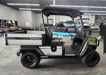 The Yamaha UMAX Rally 2+2 Carbon Metallic is a 4-passenger utility vehicle with an automotive-style build, featuring two convertible rear-facing seats that fold down to create storage . It is designed for both work and recreation, with a 402cc Yamaha engine, a lift kit, 23-inch tires, a front brush guard, and a rear storage basket. The specific Carbon Metallic color is one of several available metallic options for the vehicle.