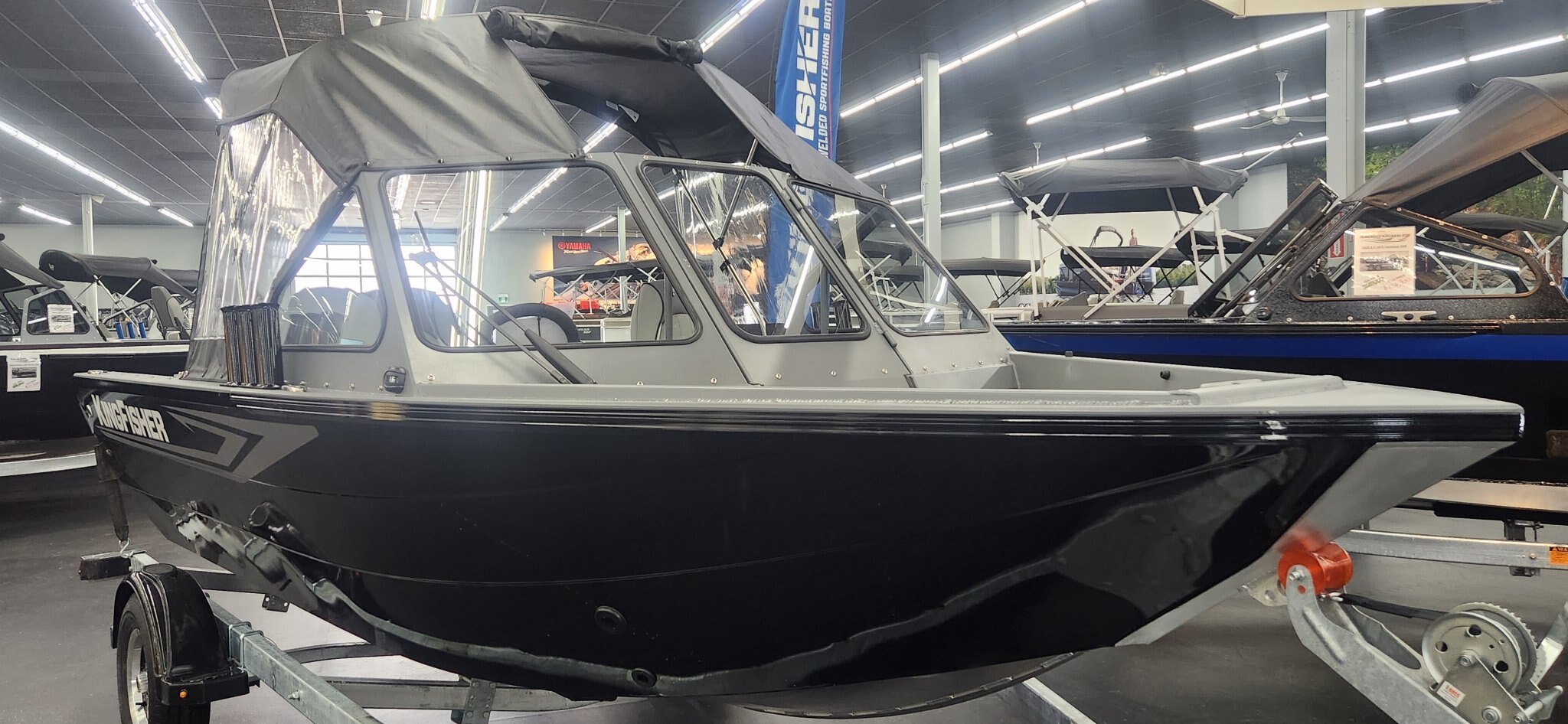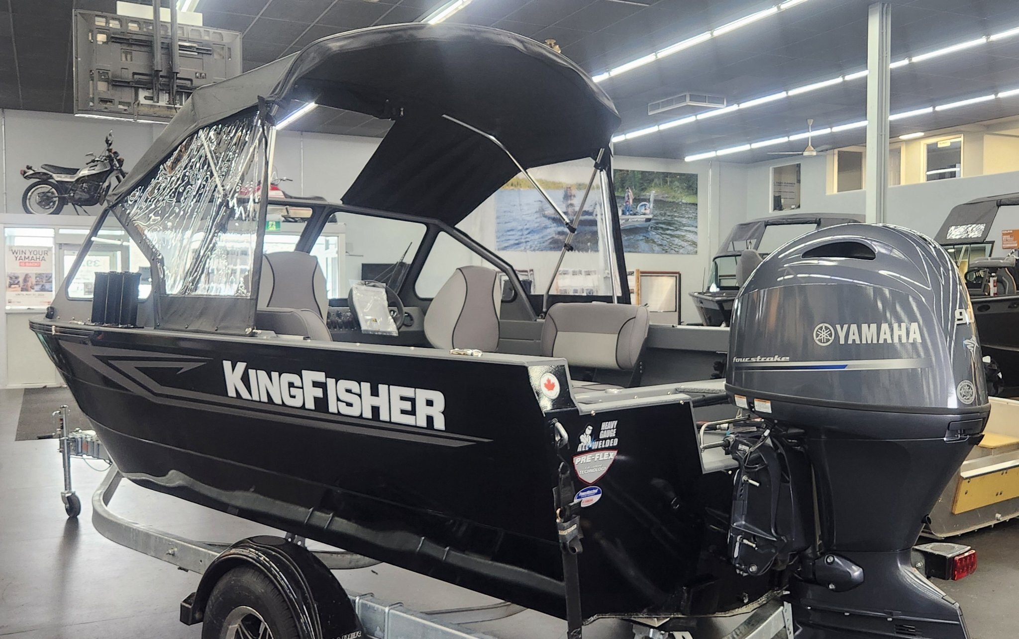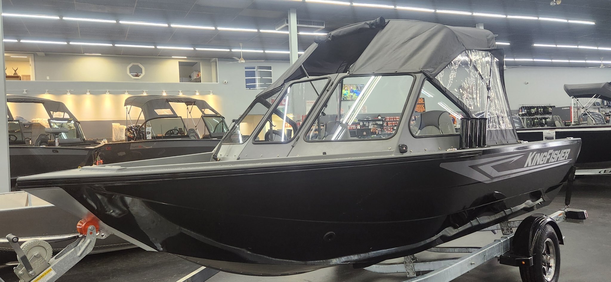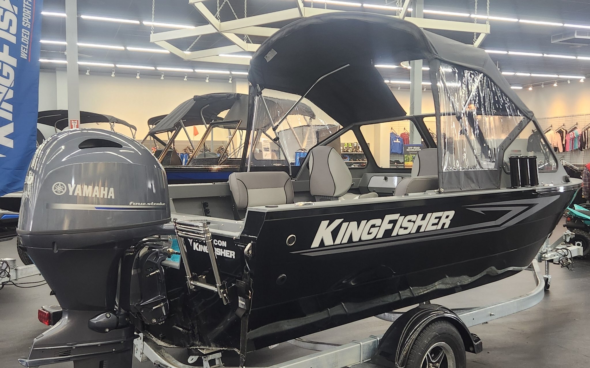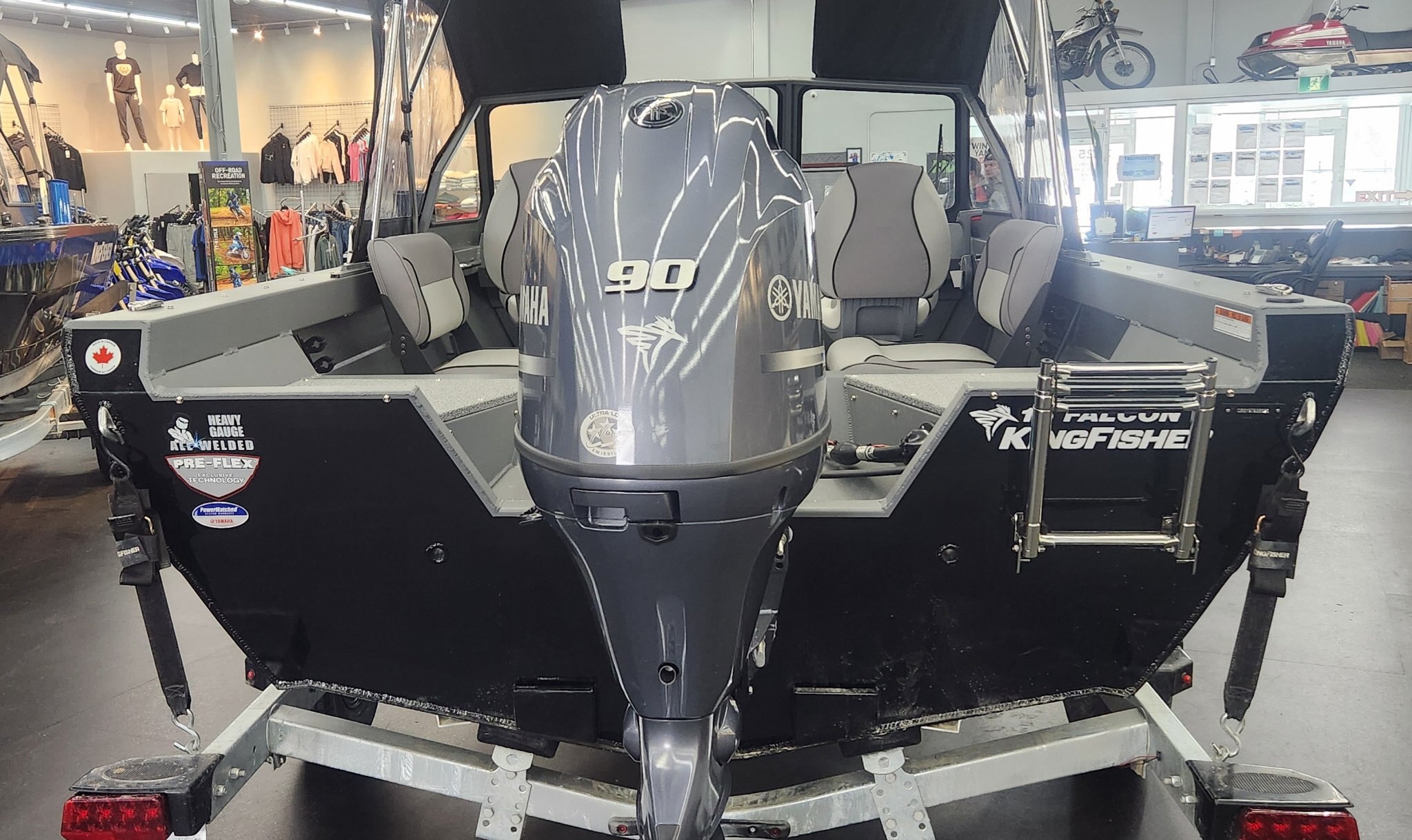 The 2026 KingFisher 16 Falcon is a 16' 6" heavy-gauge aluminum fishing boat with a 7' 4" beam, 12-degree deadrise, and 950 lbs dry weight . It features Pre-Flex® hull technology, a 95L (25 USG) fuel tank, and is rated for a max 90 HP engine. It includes a galvanized trailer and is designed for easy towing and versatile, durable performance.